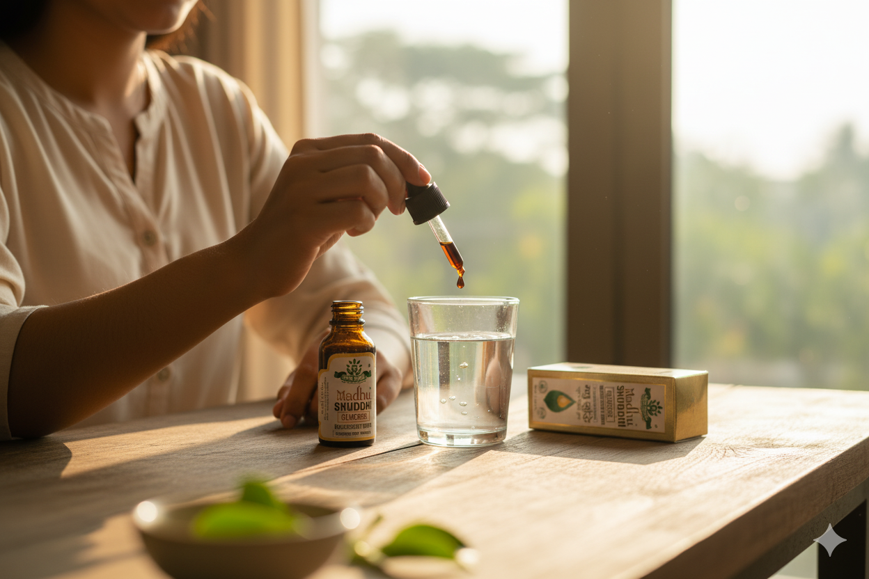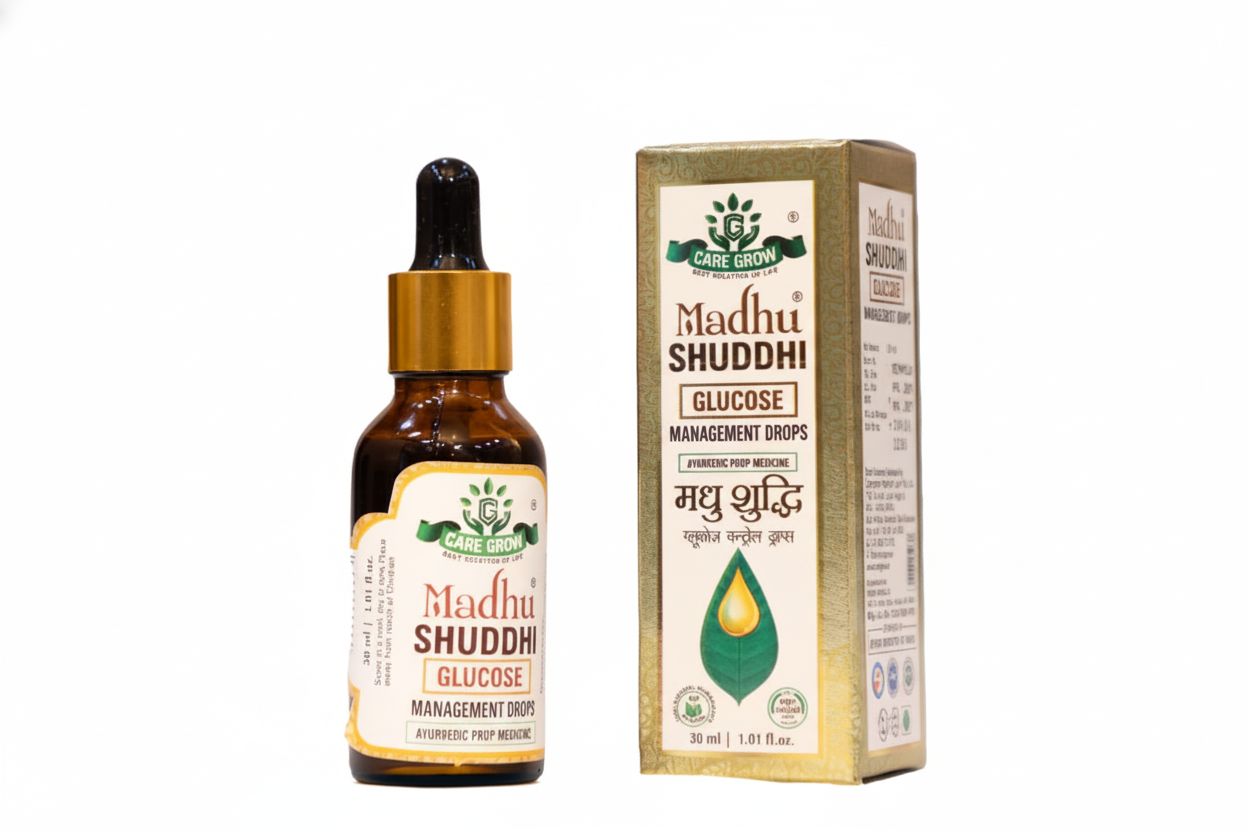 Madhu Shuddhi Glucose Management Drops is a concentrated Ayurvedic Proprietary Medicine specially crafted for today’s fast-paced lifestyle. Its advanced herbal formula is designed for quick absorption, allowing the active ingredients to enter your system faster and support more effective glucose regulation.
